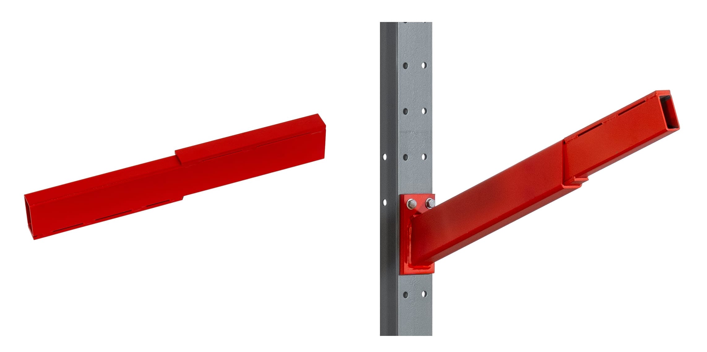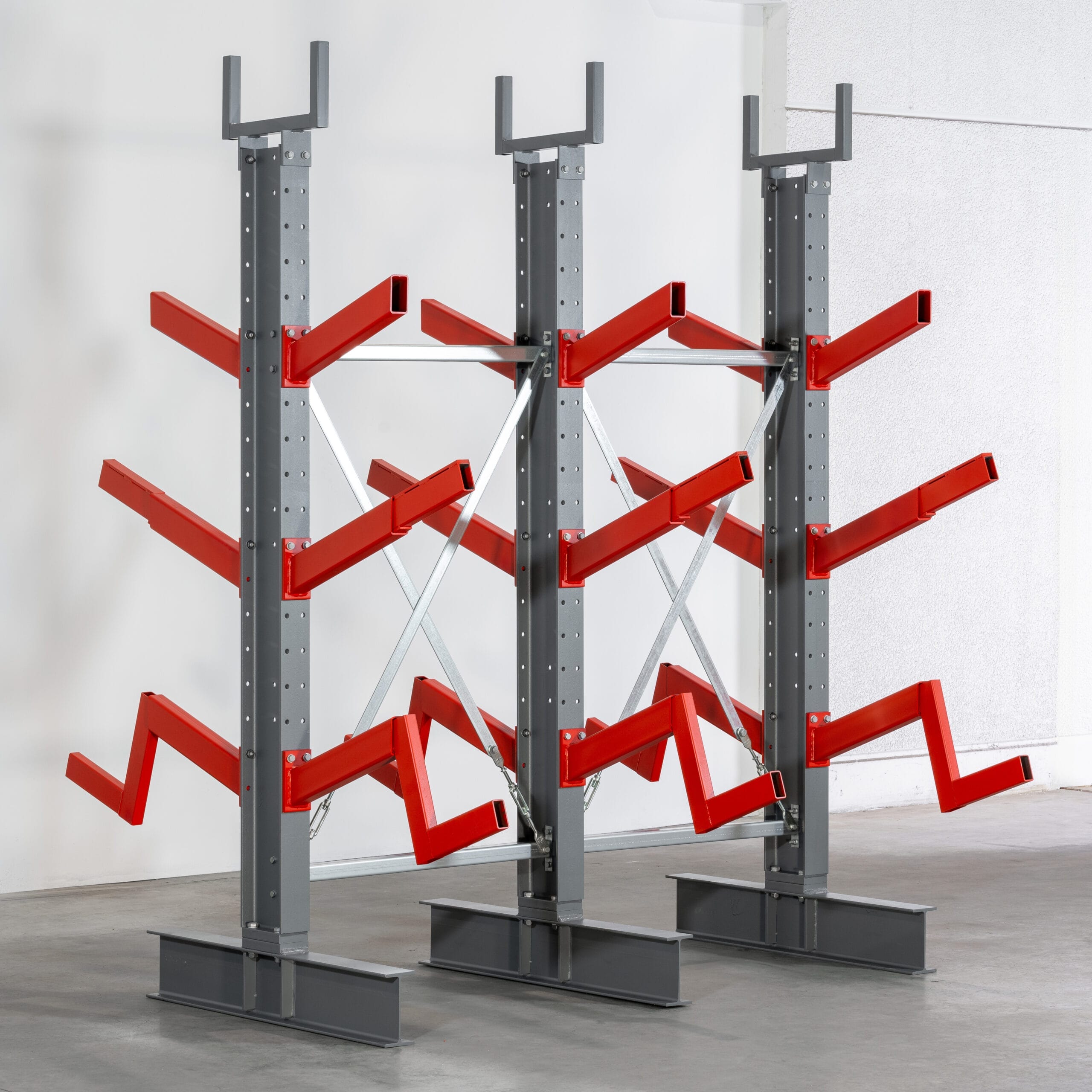 Onze Schuine armstelling is de perfecte oplossing voor de veilige opslag van lange, ronde of volumineuze goederen. Hiertoe behoren bijvoorbeeld buizen, balken, houten latten of stangen. De schuine armen zijn in een hoek van 20° aangebracht om het wegrollen of naar beneden vallen van de opgeslagen goederen te voorkomen. De Schuine armstelling heeft dezelfde basis als de handbediende Draagarmstelling, maar is alleen verkrijgbaar in een tweezijdige uitvoering. Daardoor biedt de robuuste constructie een draagvermogen tot 3000 kg per zijde bij een armlengte van 500 mm.