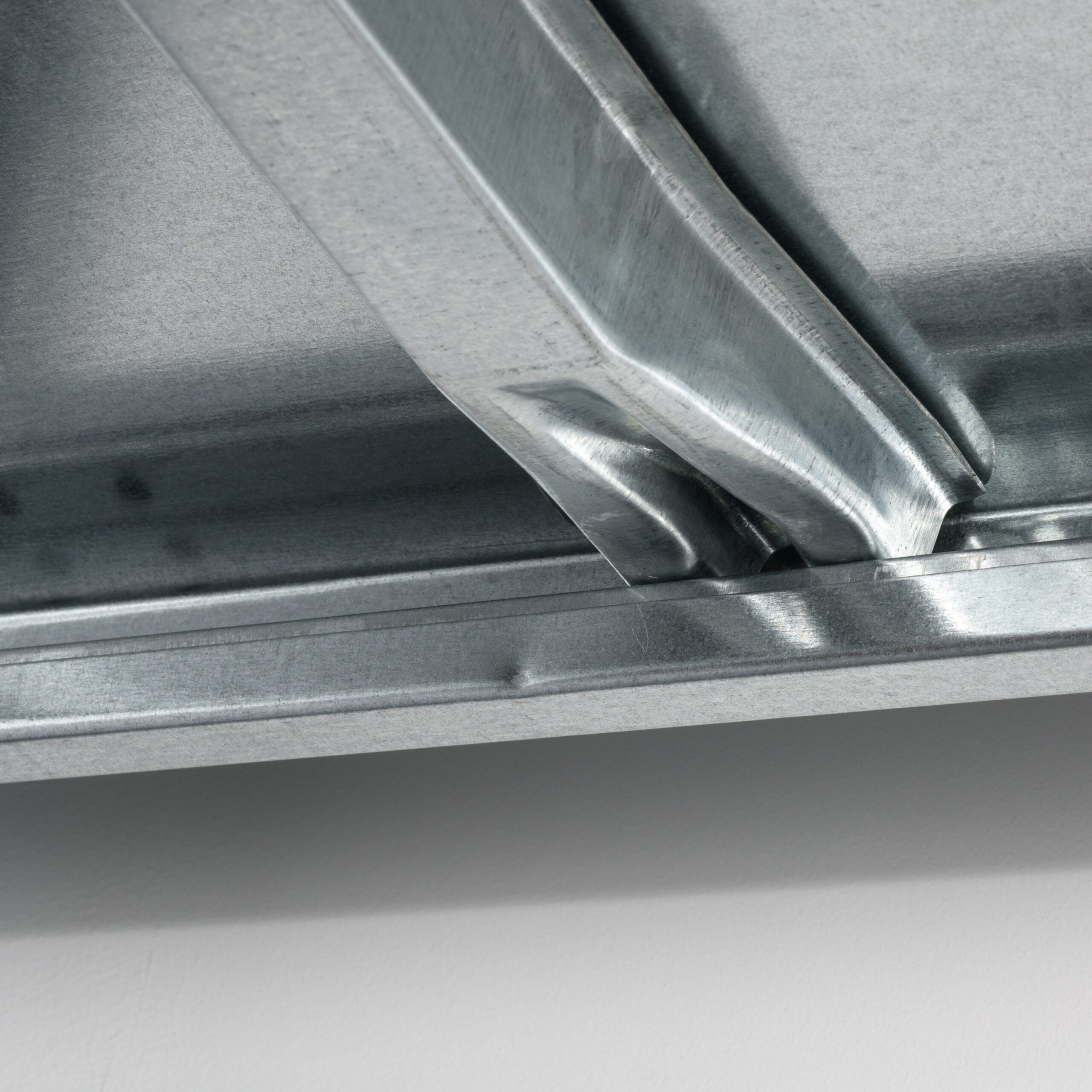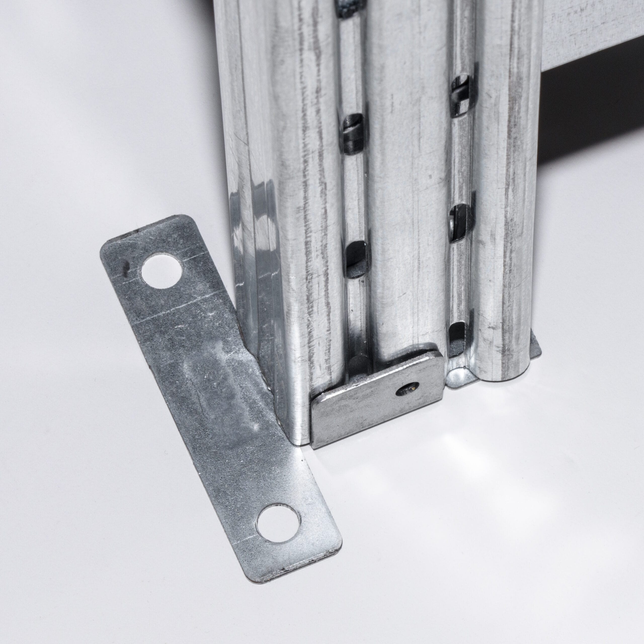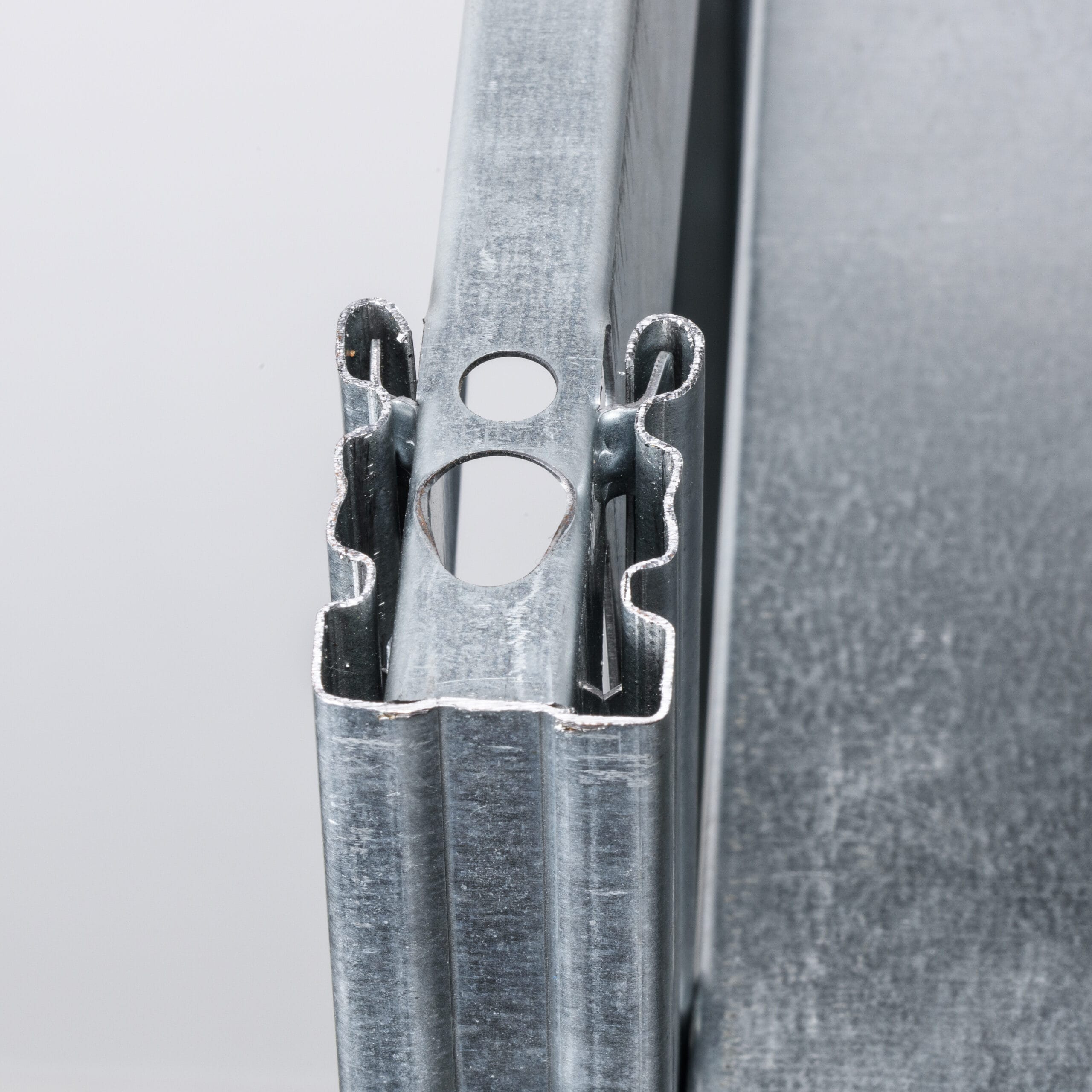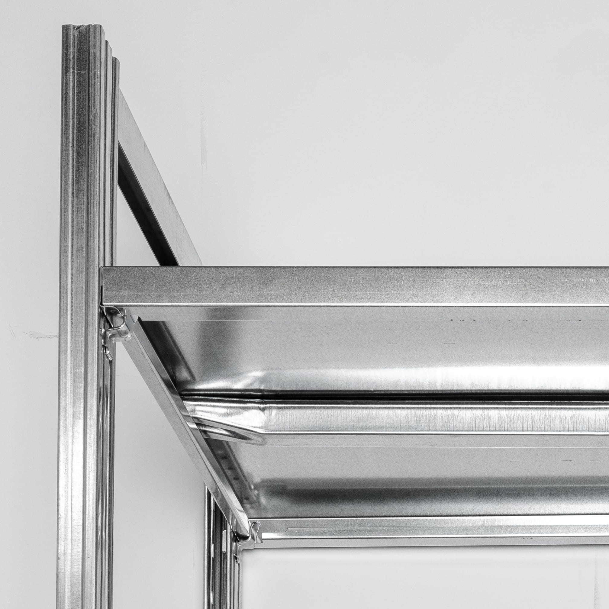 Nahaufnahme von Raecks Fachbodenregal in verzinkt, mit verzinkten Stahlträgern mit metallisch glänzender Oberfläche und präzisen Verbindungen - die perfekte Verstärkung für Regalgestelle.